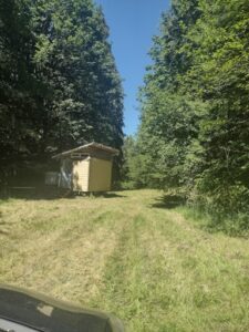 When you see this septic flushable bathroom, you’ll know you’re pulling up to Family Camp! There should be a left hand turn and a sign about this point toward the Cabin. You can camp anywhere in Family Camp, which stays mostly shaded, except the area you see by the bathroom… This picture is taken midday. The trees keep the area decently shaded morning/evening.